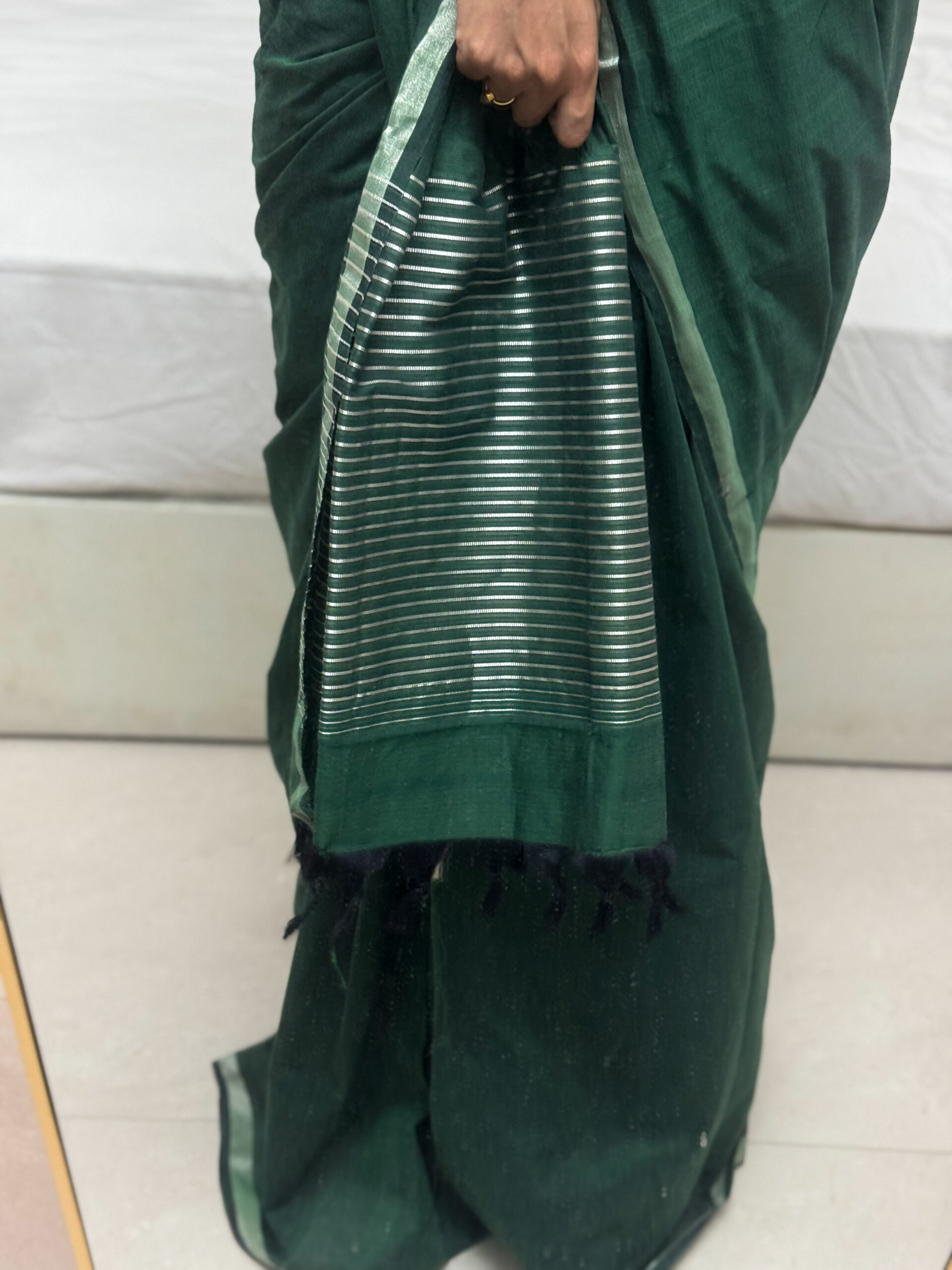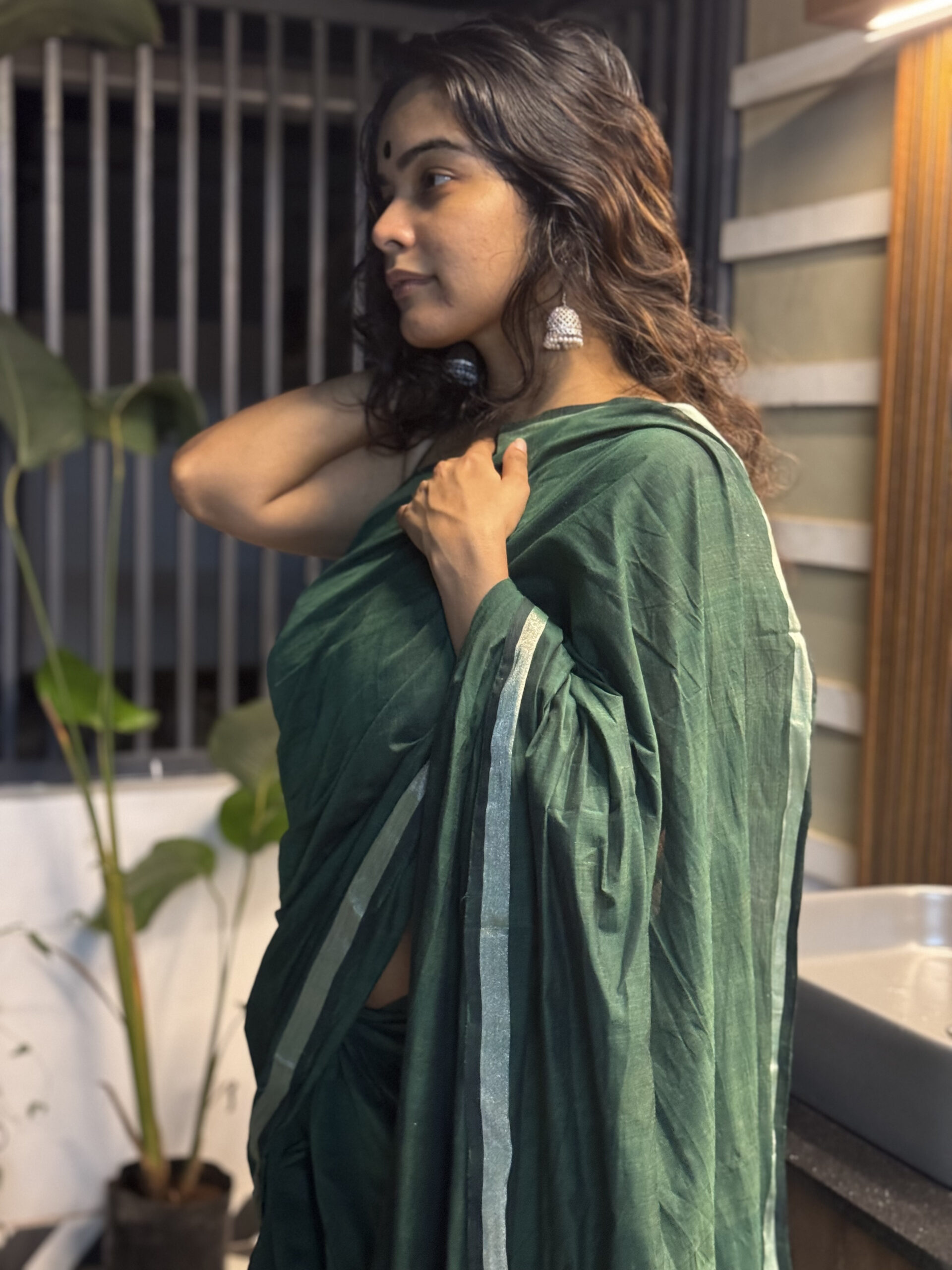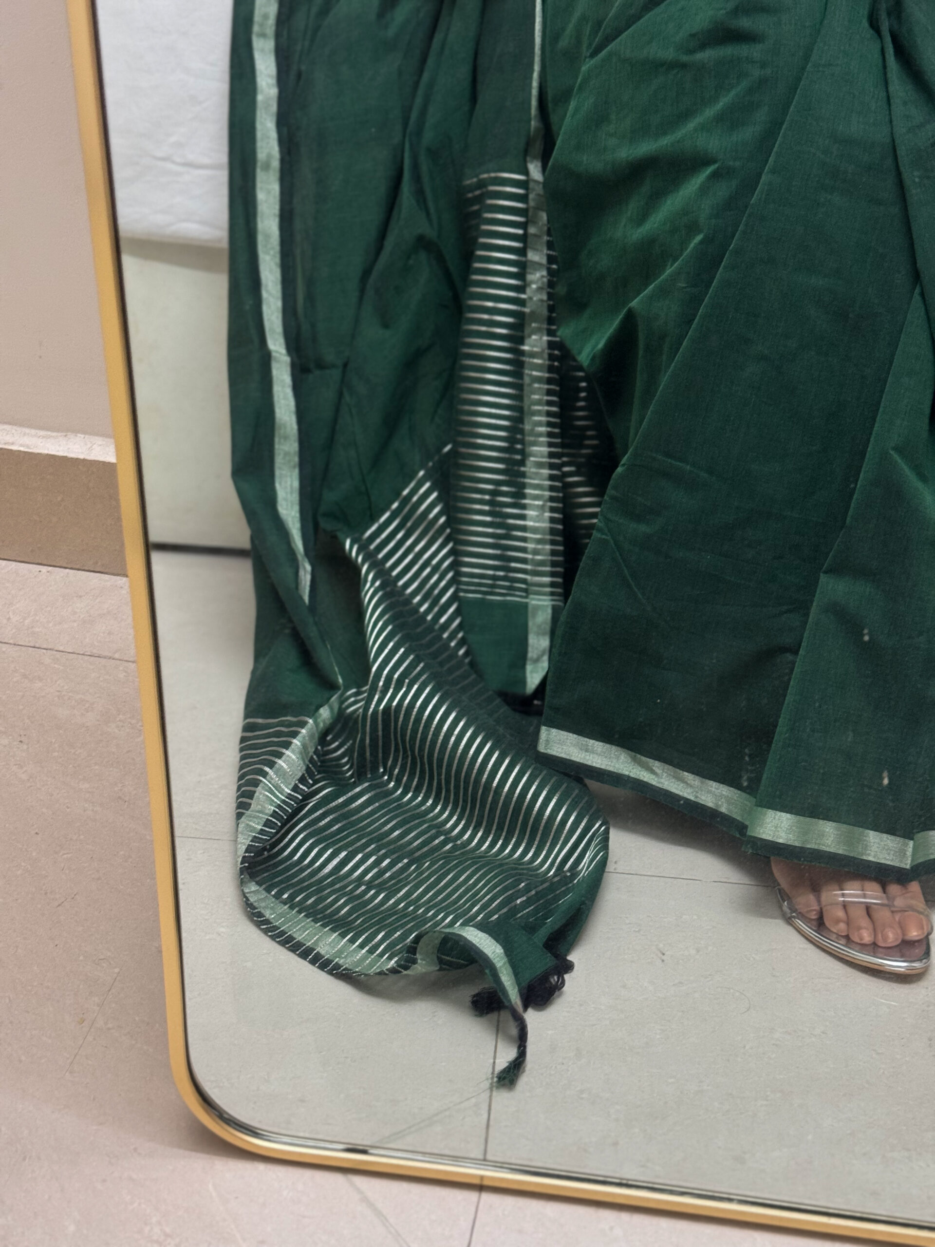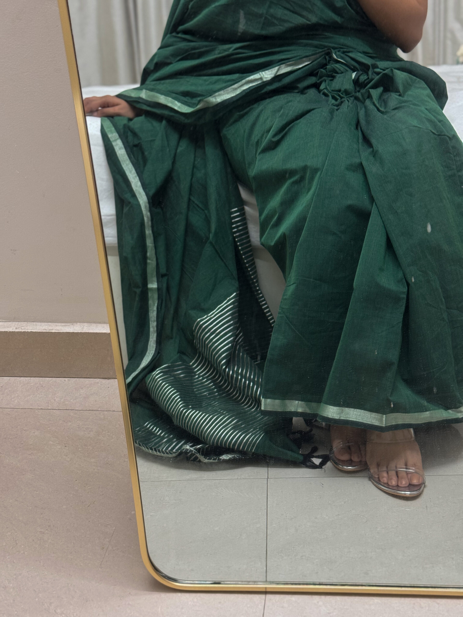This green is a unique one, adorned with silver zari weaves from the looms of Chendamangalam