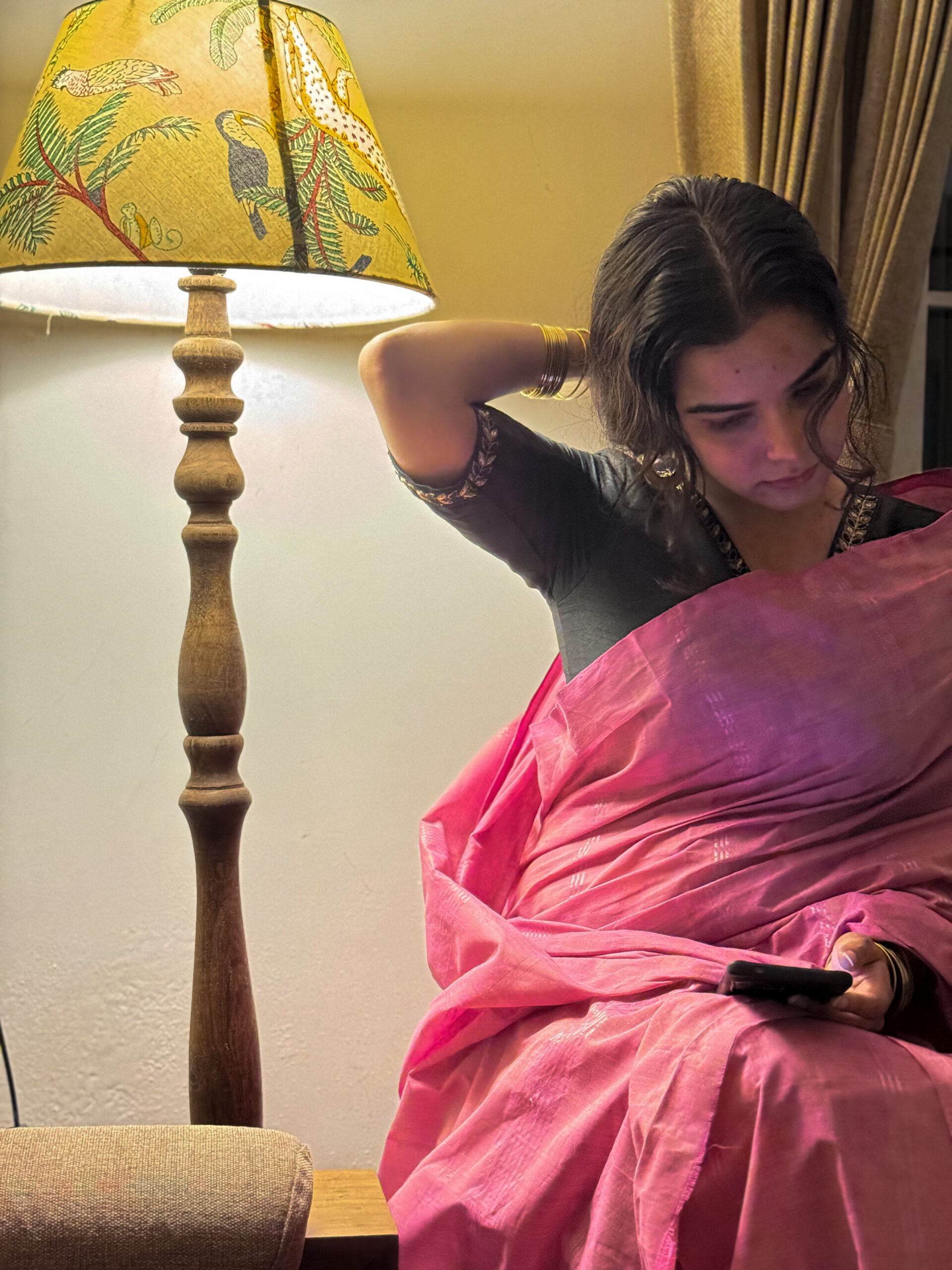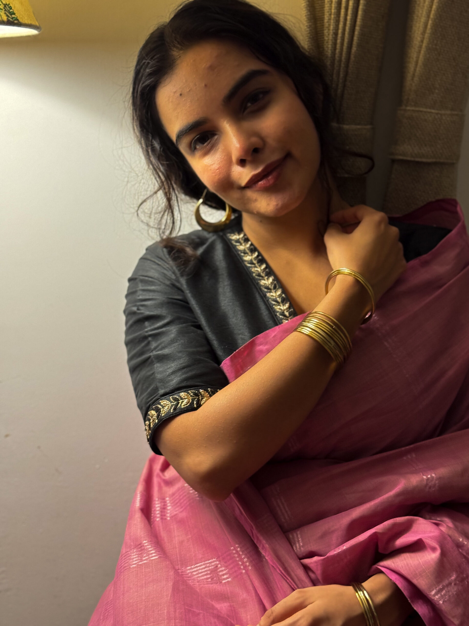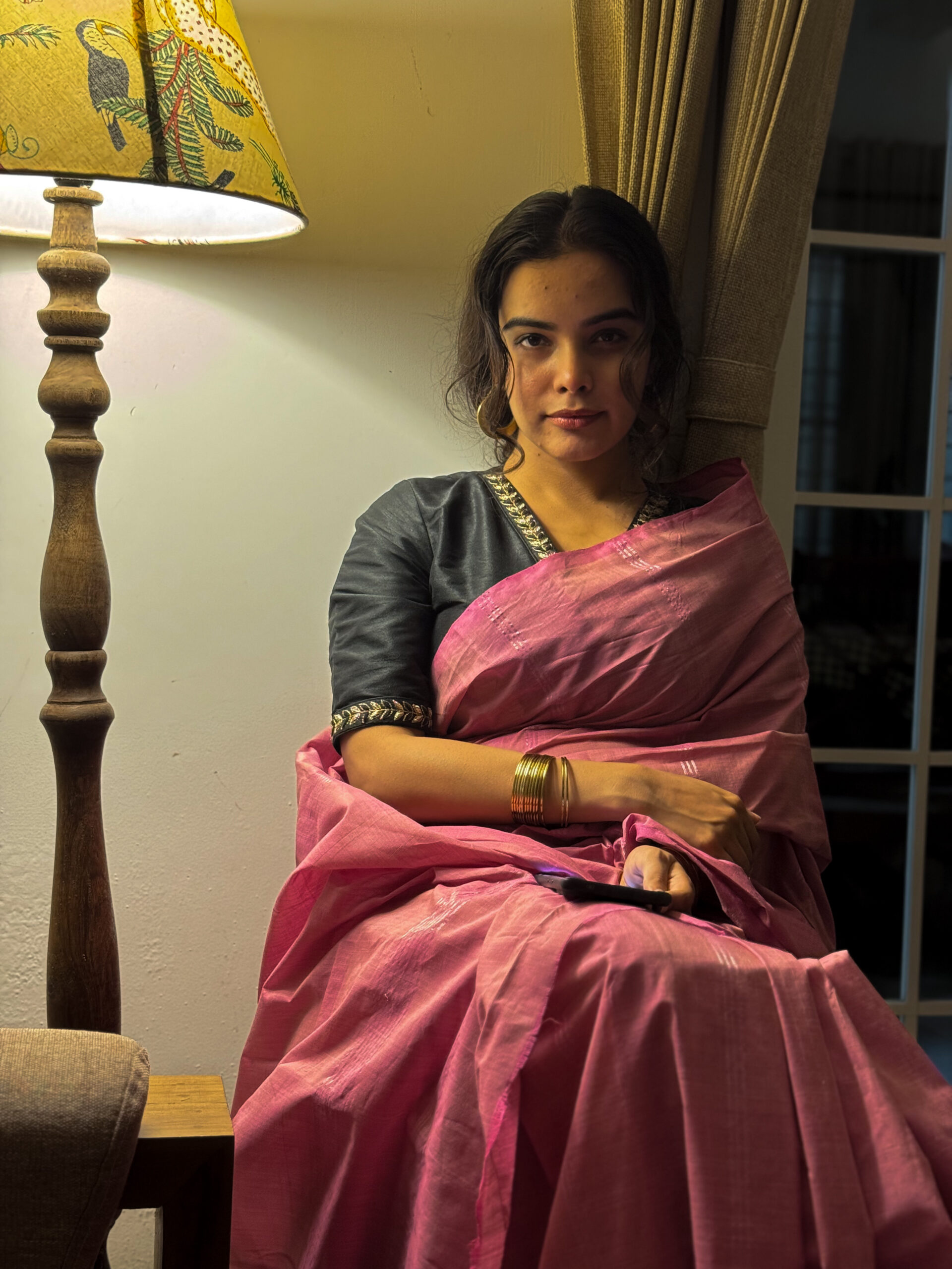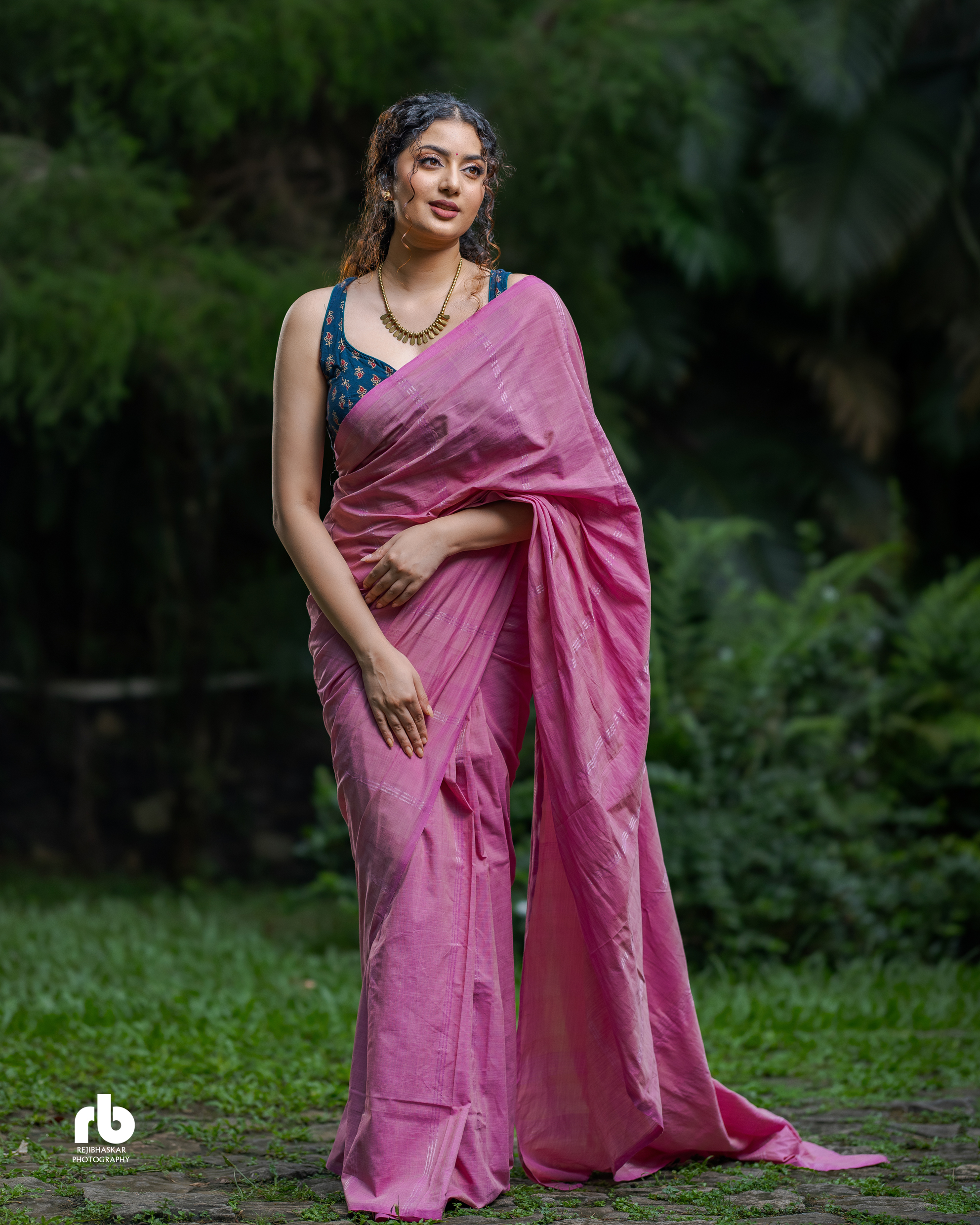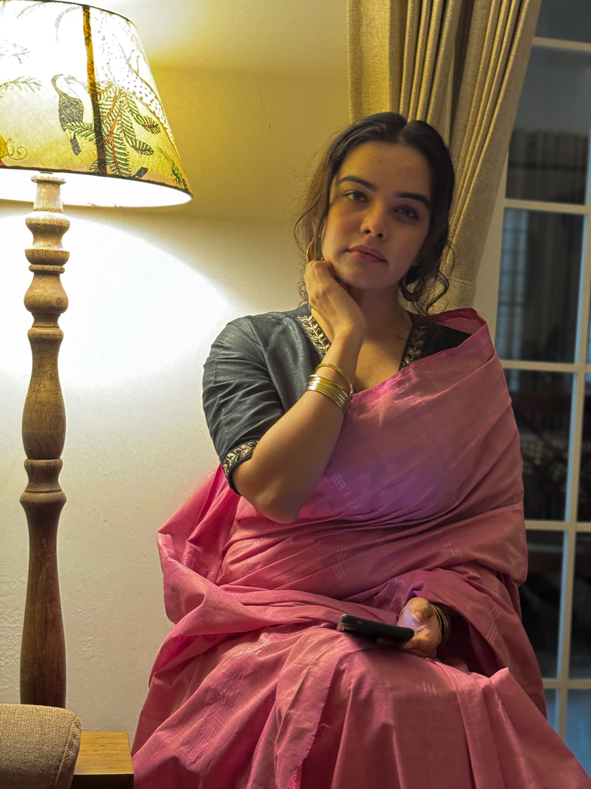 Flush like a blush in Naira , from the weaves of Chendamangalam woven with silver Zari