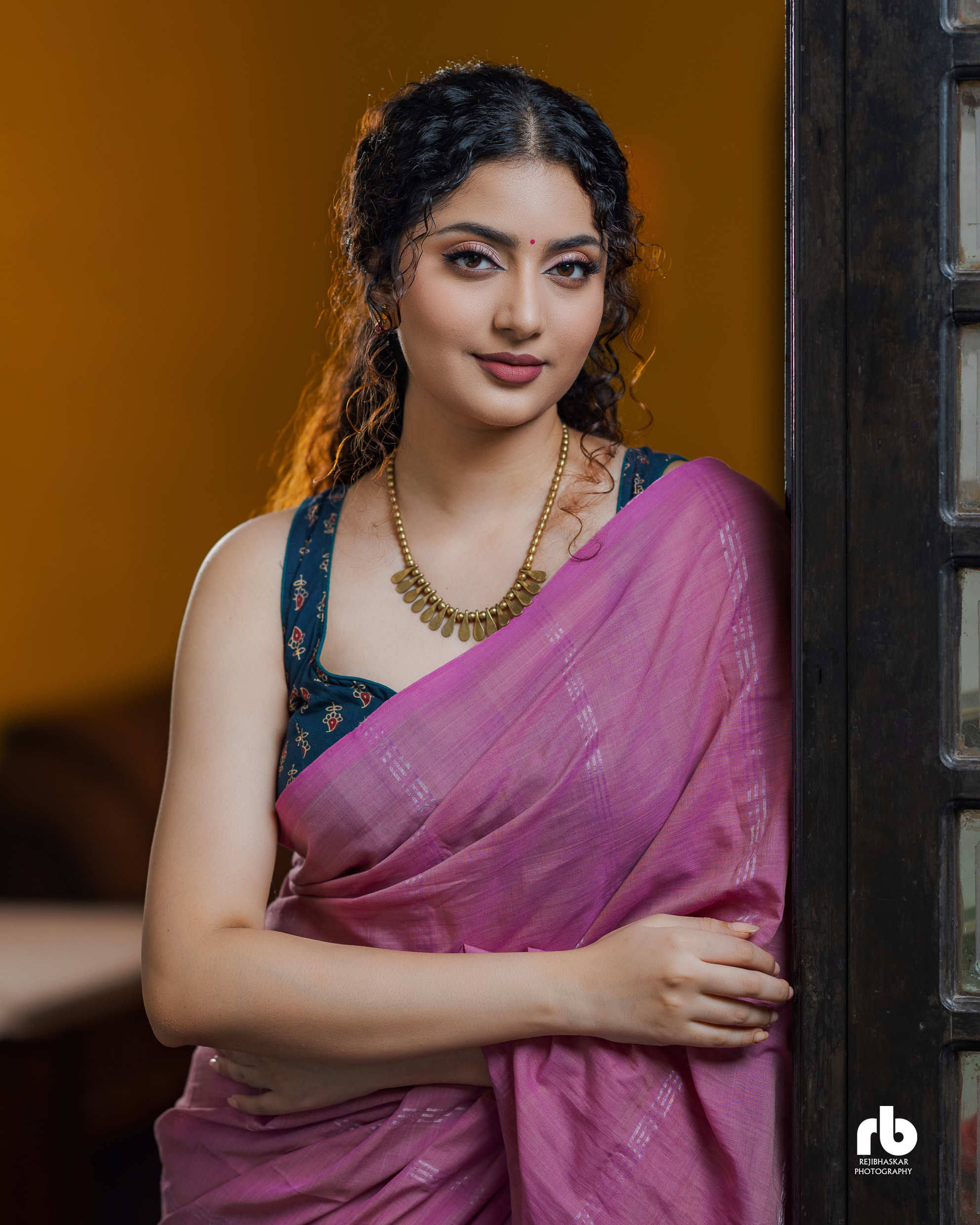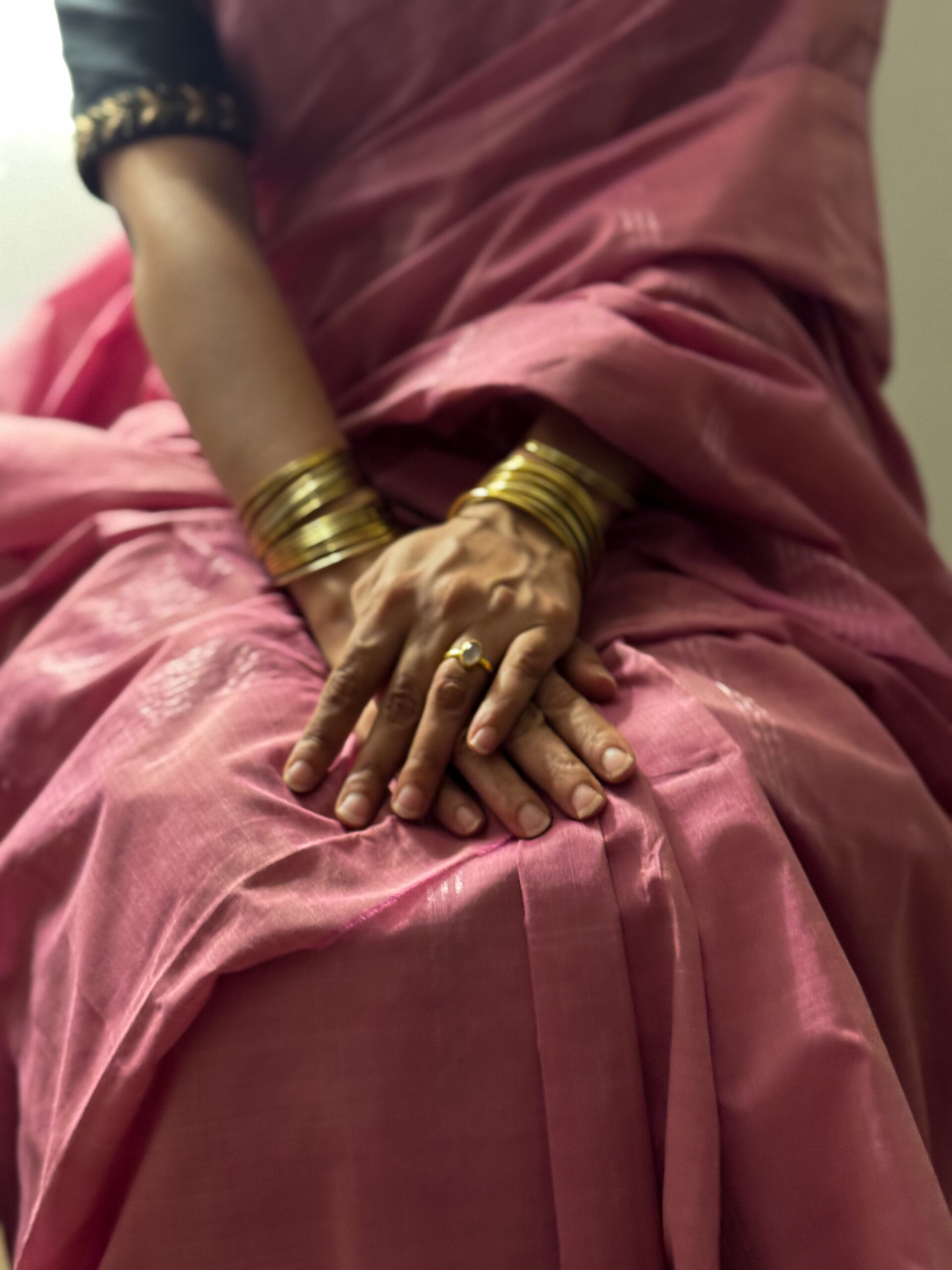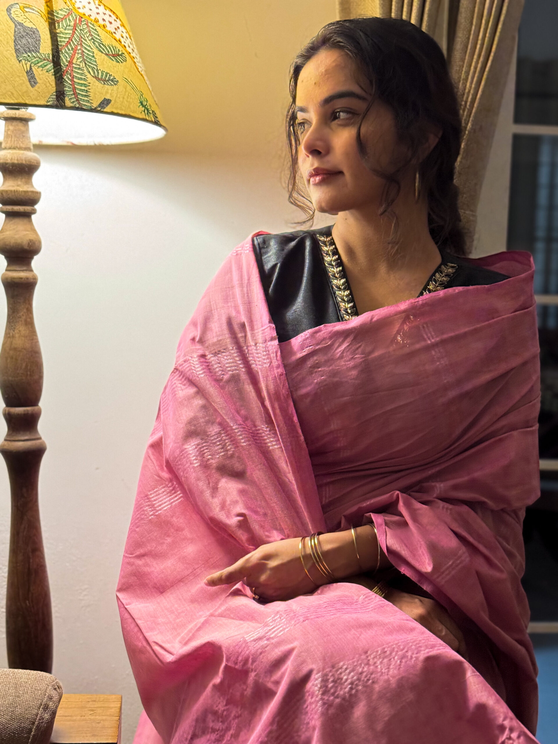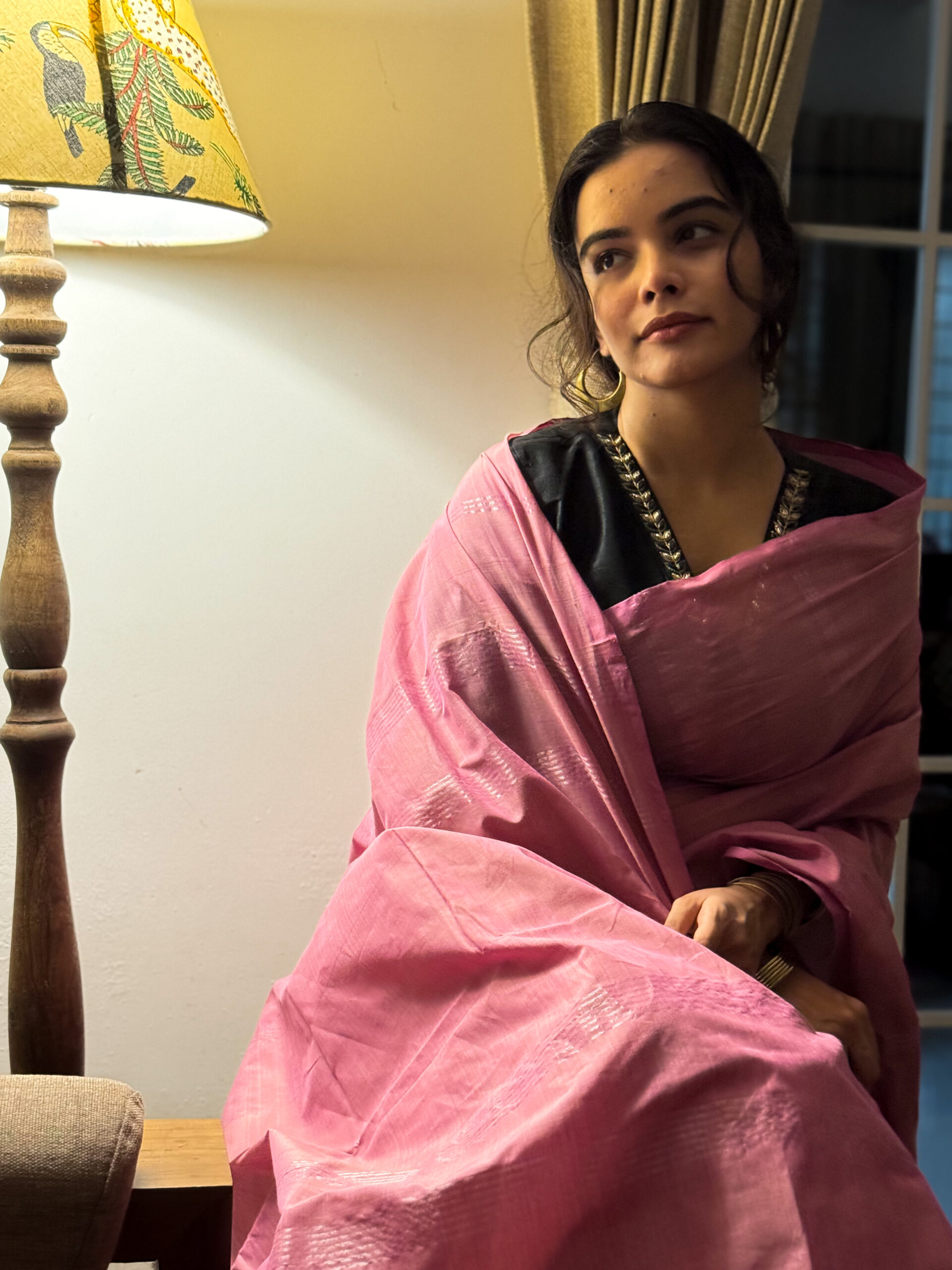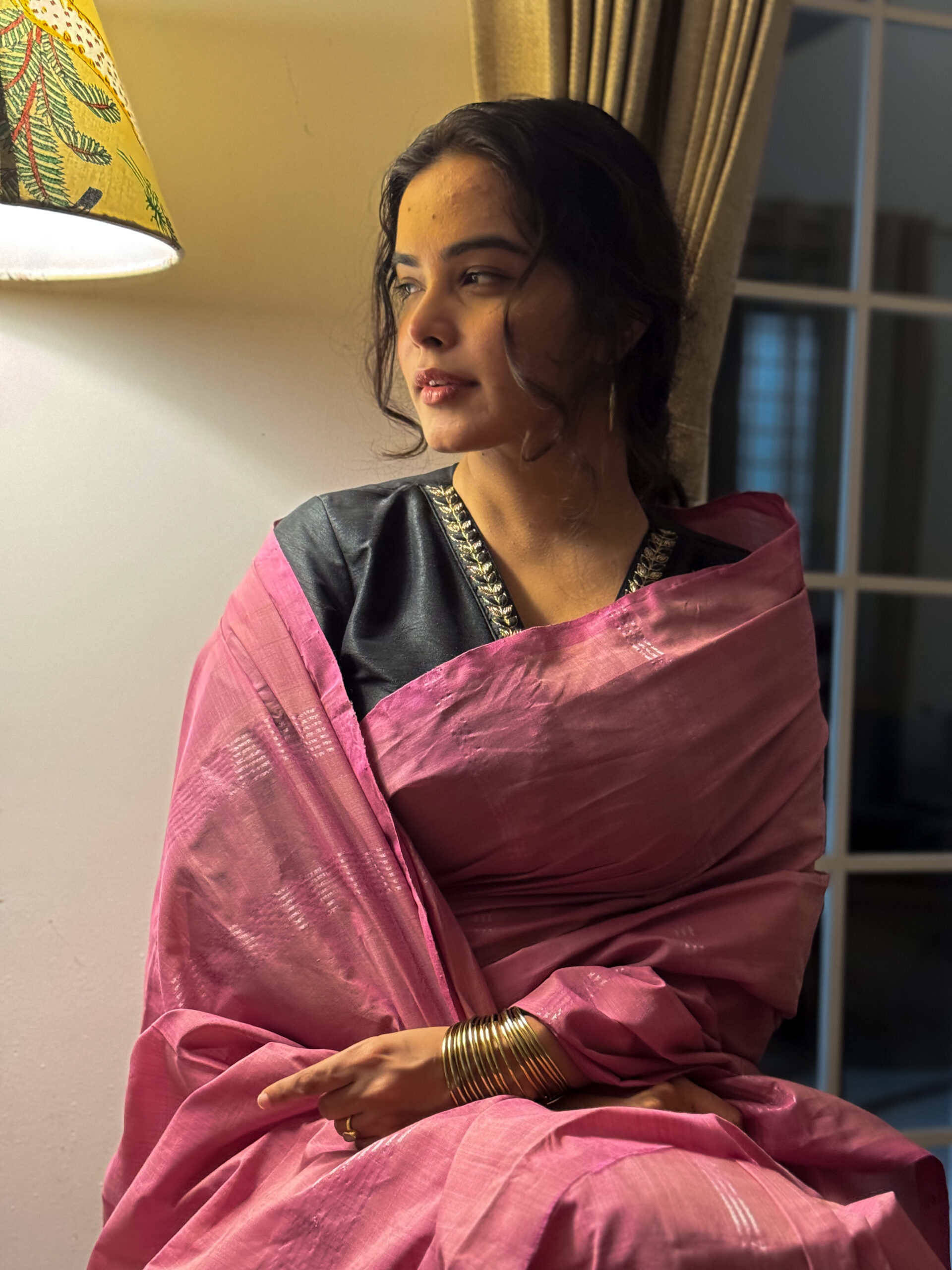 Flush like a blush in Naira , from the weaves of Chendamangalam woven with silver Zari