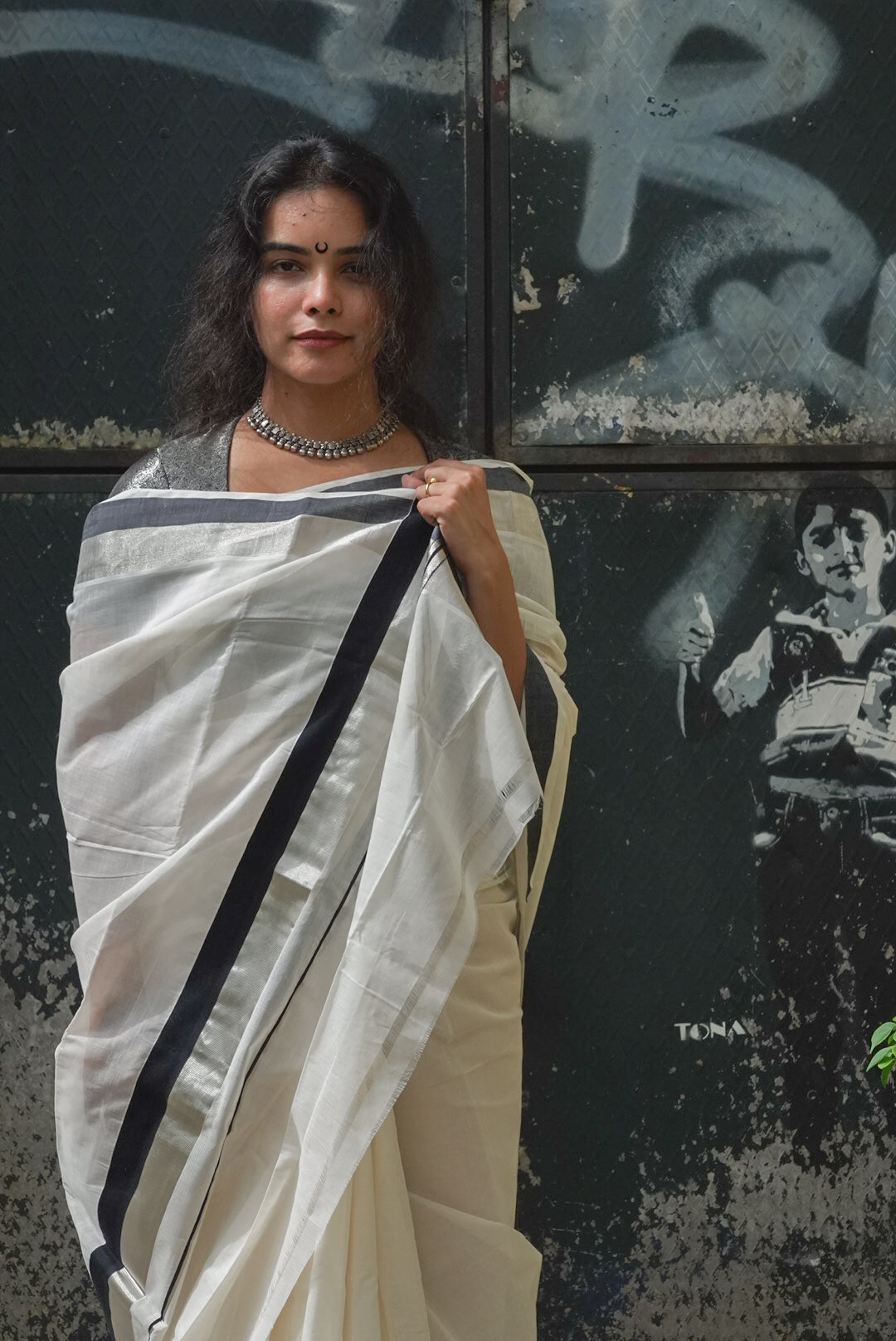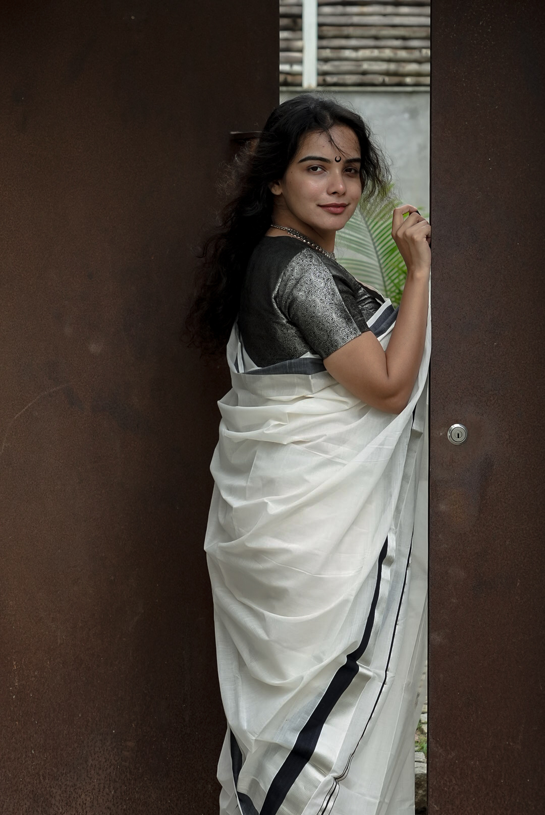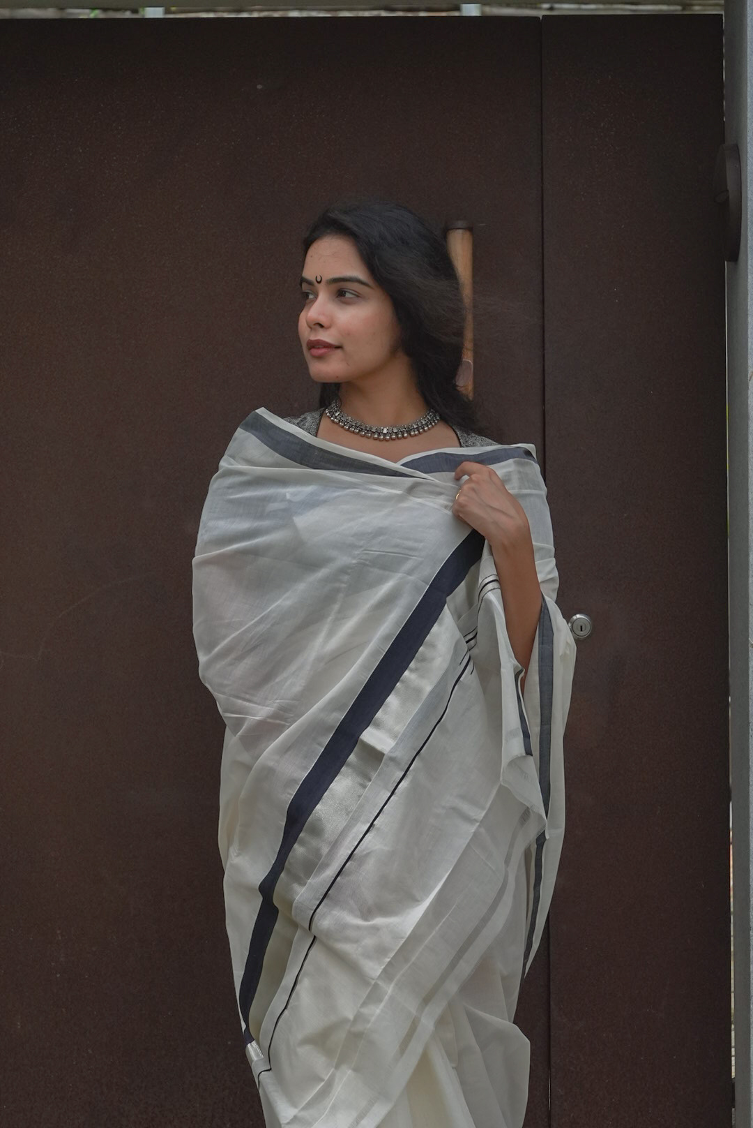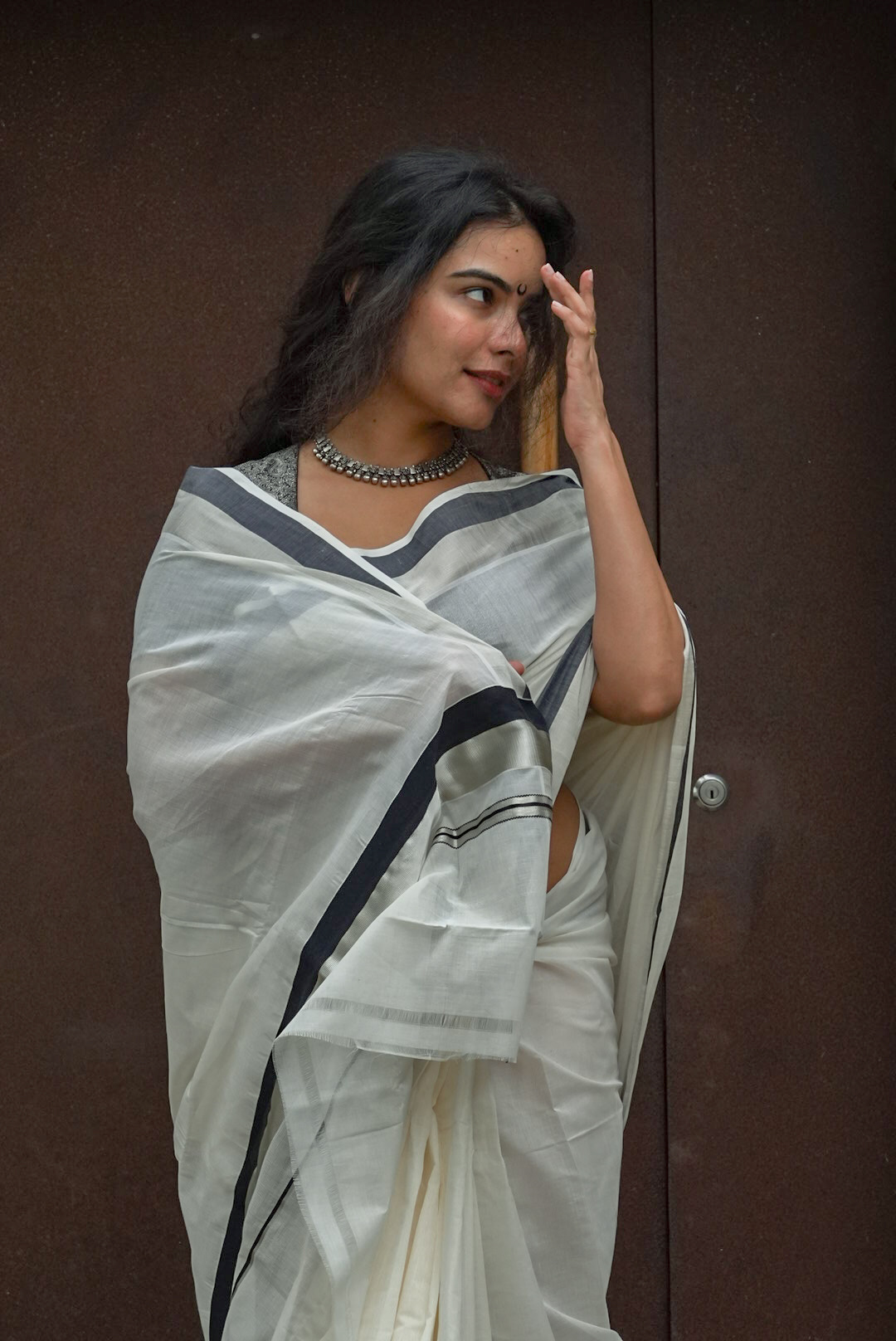 From the weaves of Chendamangalam, to you, this Onam. Silver Zari entwined with black kara to give you a distinct look this Onam season!