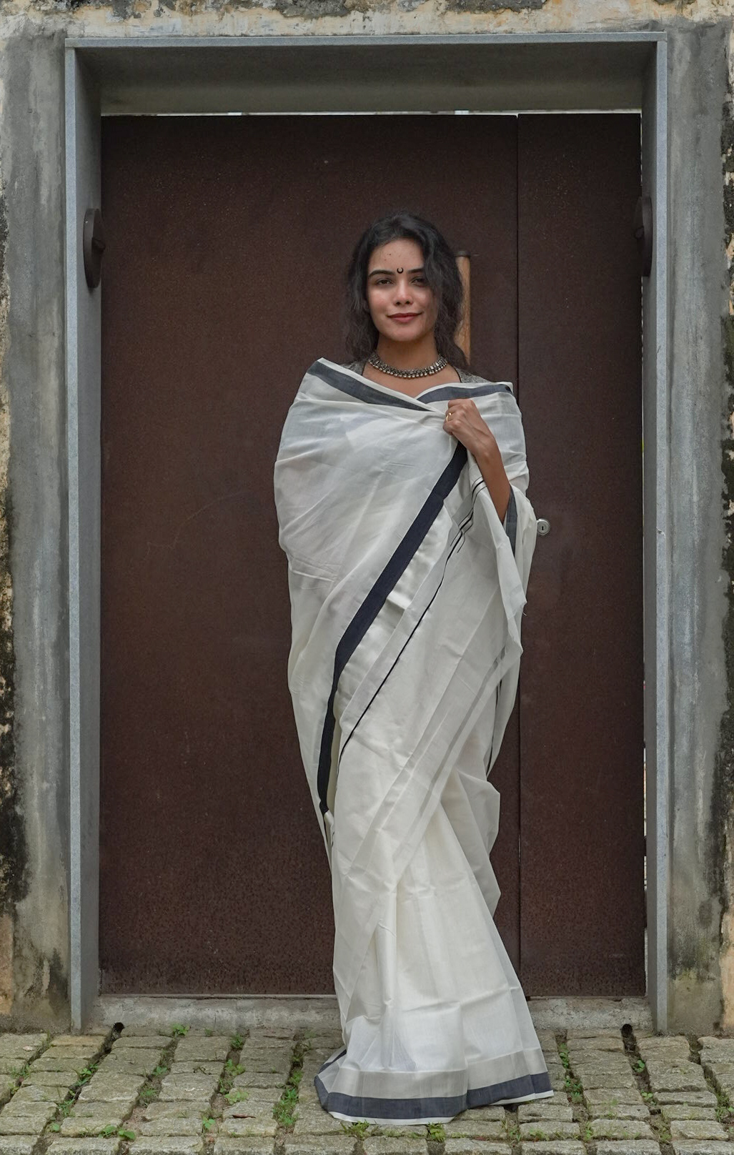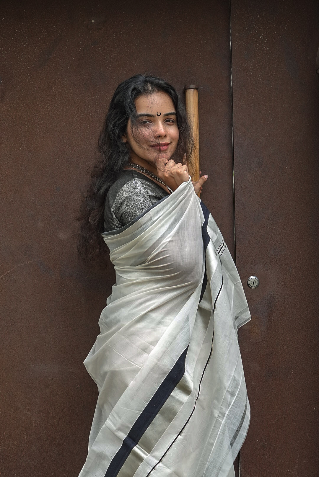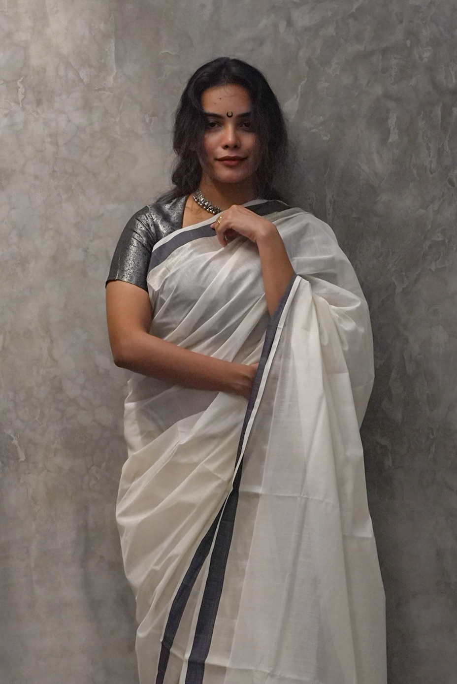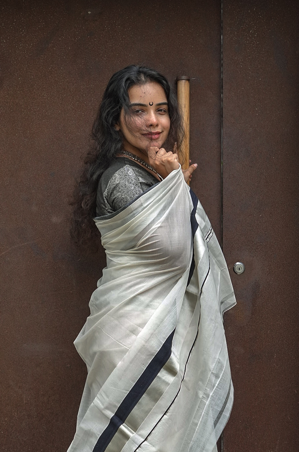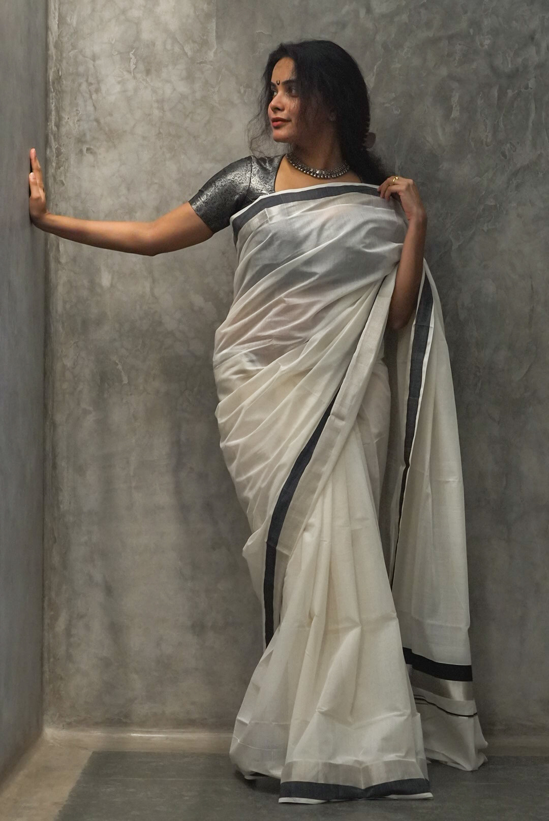 From the weaves of Chendamangalam, to you, this Onam. Silver Zari entwined with black kara to give you a distinct look this Onam season!