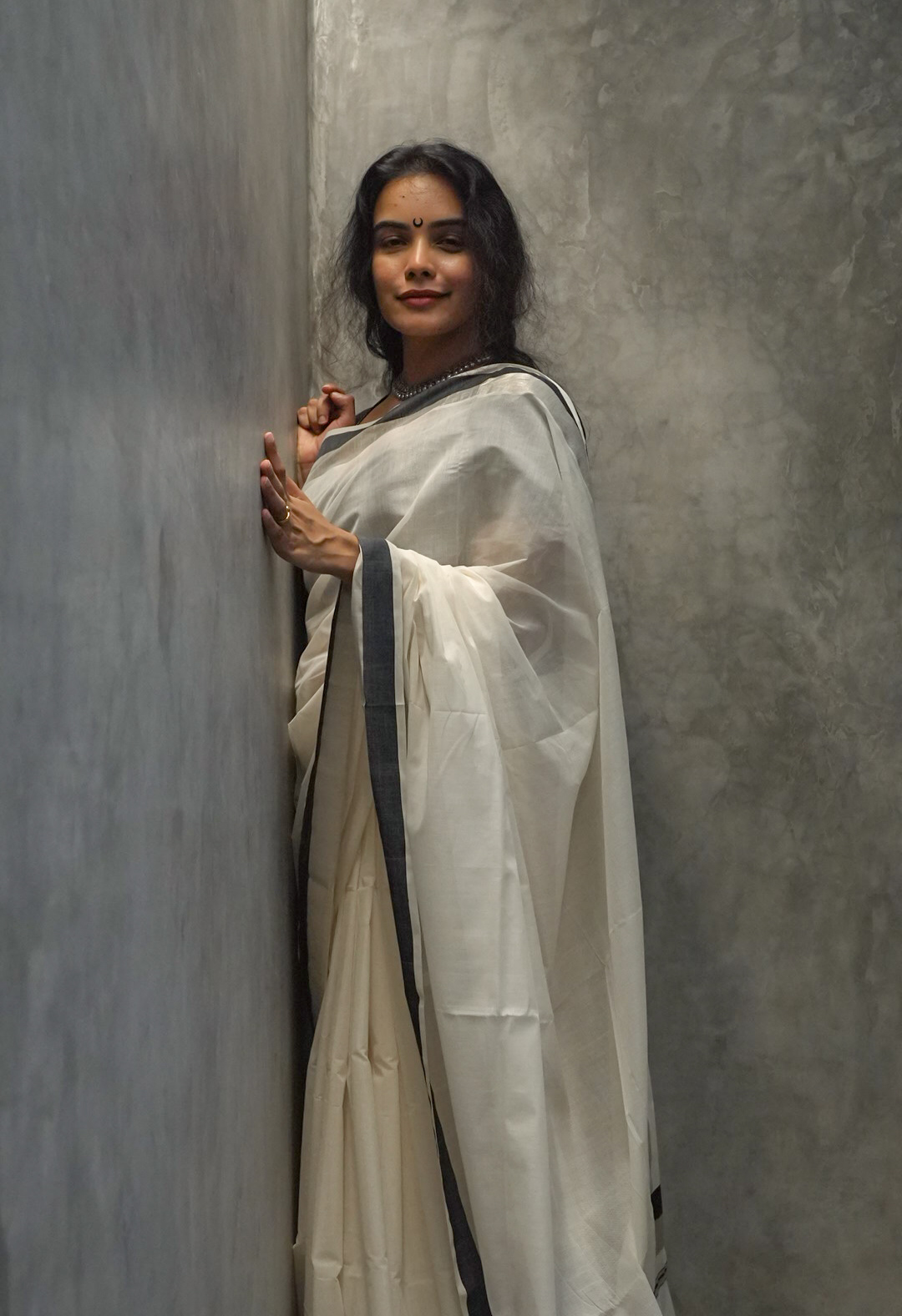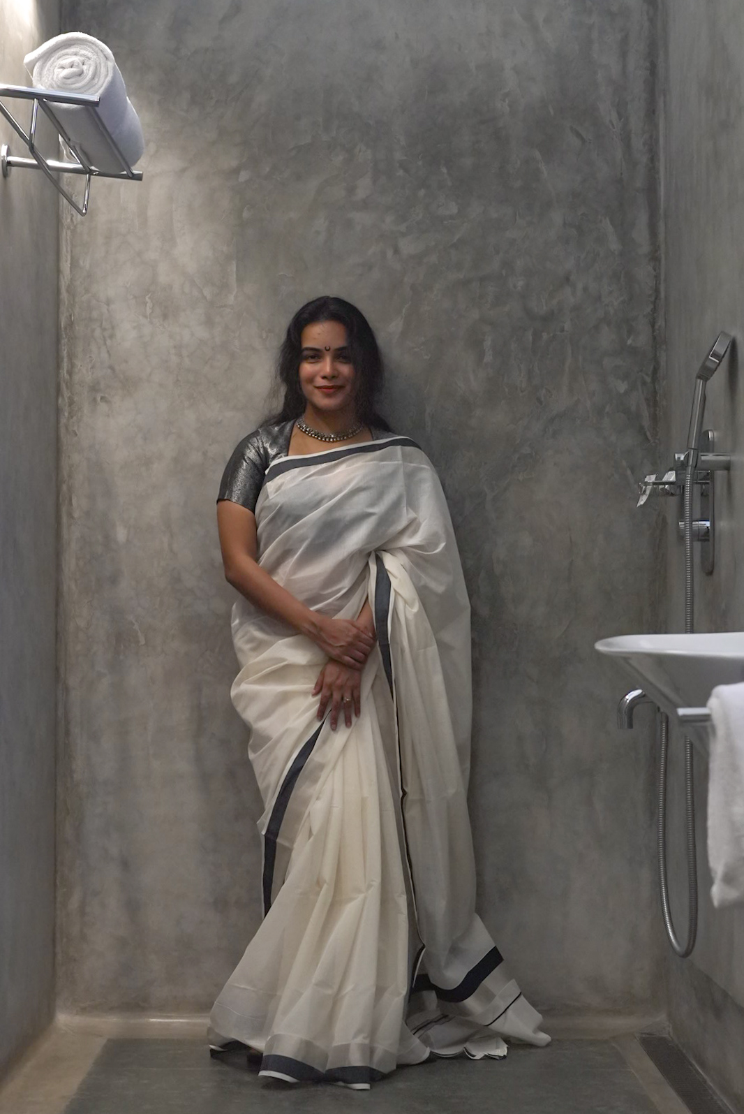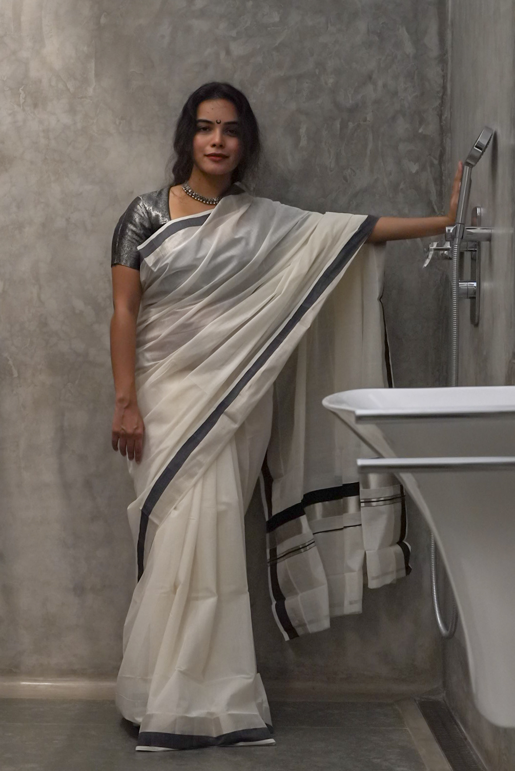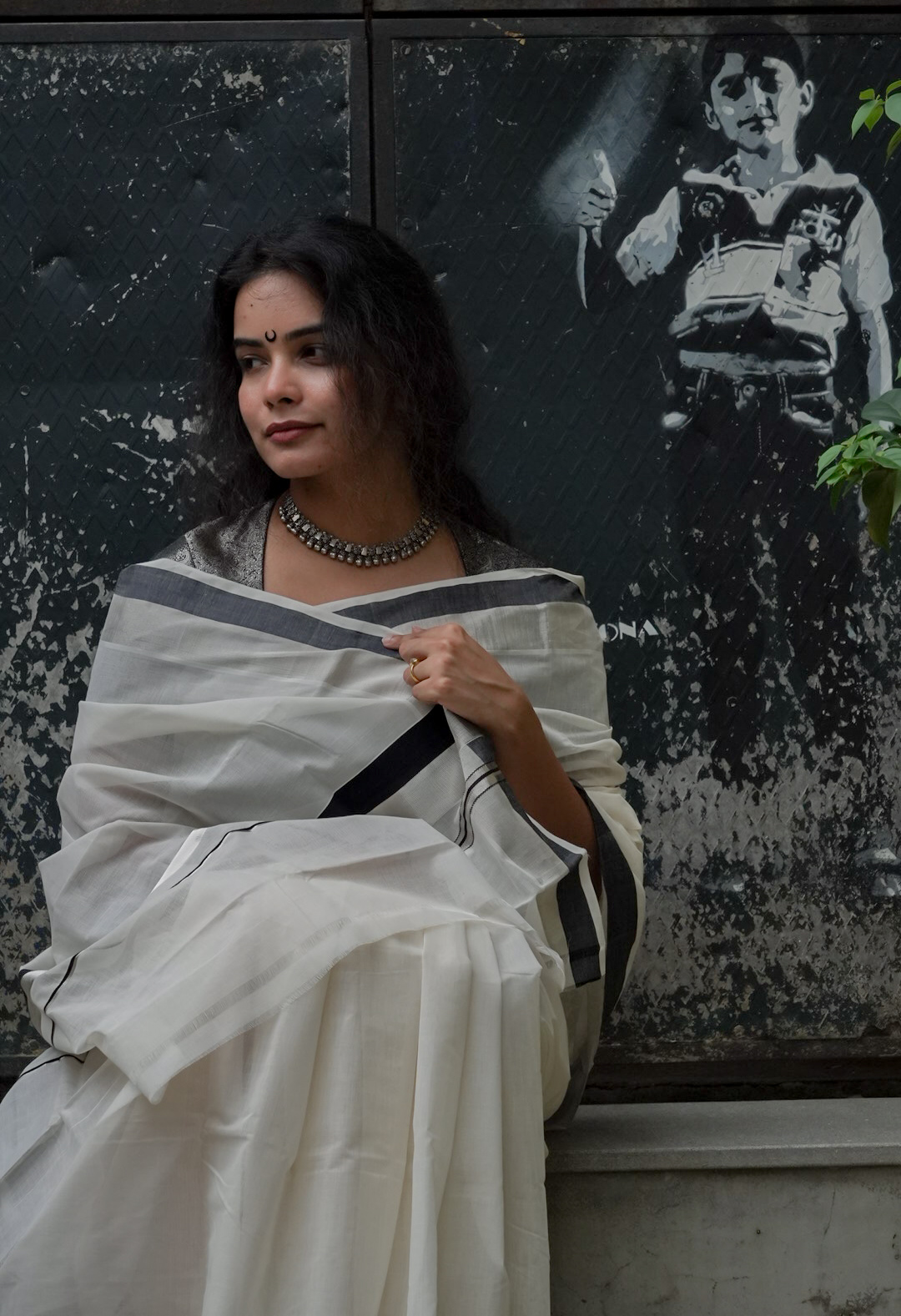 From the weaves of Chendamangalam, to you, this Onam. Silver Zari entwined with black kara to give you a distinct look this Onam season!